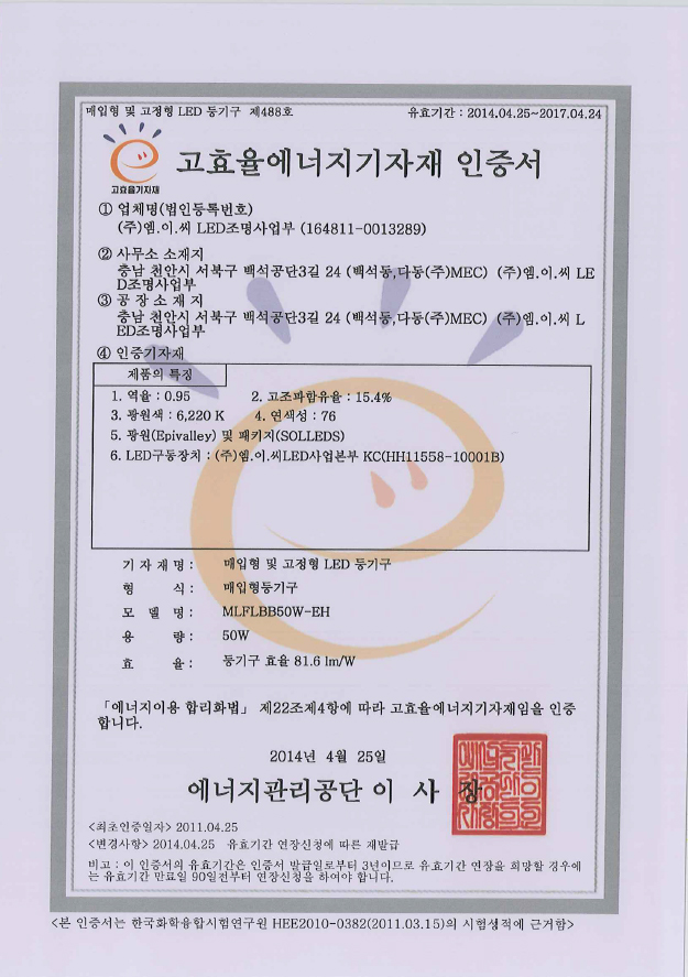 인증 | 매입형-및-고정형-LED-등기구-제-488호-MLFBB50W-EH