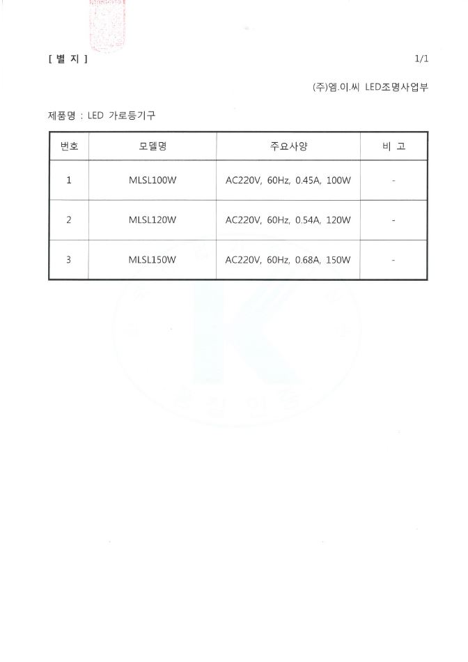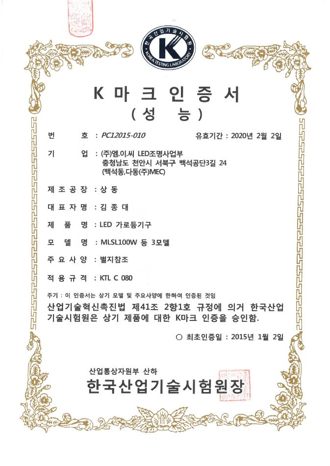 인증 | K마크인증서(LED가로등기구-100W,120W,150W)