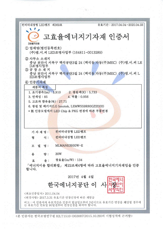 인증 | 제369호-LED램프-MLMANE3930W-E