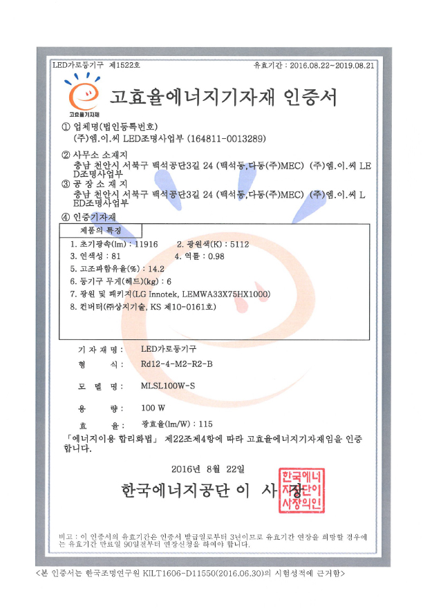 인증 | 제1522호-LED-가로등기구_MLSL100W-S